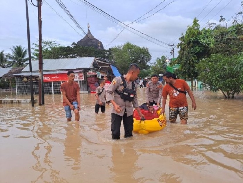 Seorang korban tak berdaya dibantu aparat dan warga saat banjir di Aceh. (Foto: Sumatralink.id/Acehprov.go.id)