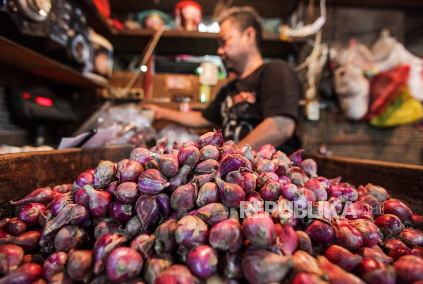 Pedagang menimbang bawang merah di Pasar Senen, Jakarta, Jumat (19/4/2024). (Foto: Republika.co.id/Putra M Akbar)