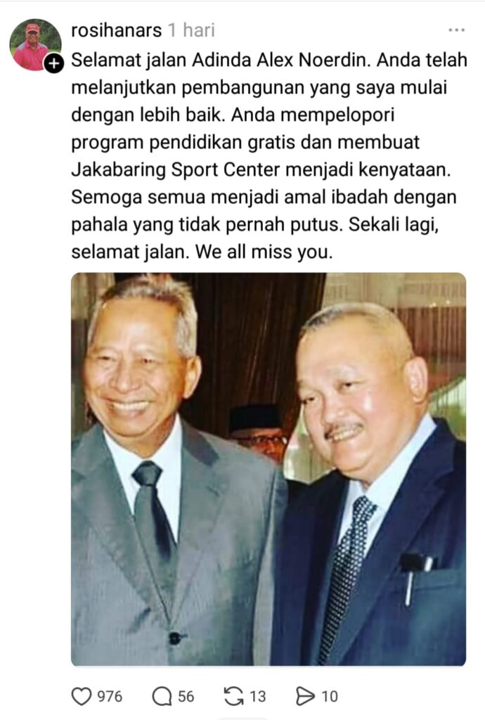 SUMATRALINK.ID, PALEMBANG – Mantan Gubernur Sumatra Selatan (Sumsel) periode 2018-2003) Rosihan Arsyad (77 tahun) turut berbela sungkawa atas meninggalnya Mantan Gubernur Sumsel Alex Noerdin (75) pada Rabu (25/2/2026) siang. Ia mengapresiasi program Alex Noerdin yang telah melanjutkan pembangunan di masanya. “Selamat jalan Adinda Alex Noerdin. Anda telah melanjutkan pembangunan yang saya mulai dengan lebih baik,” tulis Rosihan Arsyad dalam akun medsosnya @rosihanars yang dikutip Sumatralink.id, Jumat (27/2/2026). Menurut Rosihan, yang pernah menjabat Kepala Staf Armada Barat Angkatan Laut (AL) RI, Alex Noerdin telah memelopori program pendidikan gratis untuk masyarakat Sumsel, dan merealisasikan kawasan pusat olahraga Jakabaring Sport Center di Jakabaring, Seberang Ulu II Kota Palembang. “Anda mempelopori program pendidikan gratis dan membuat Jakabaring Sport Center menjadi kenyataan,” lanjut Rosihan Arsyad yang menjabat gubernur Sumsel menggantikan Gubernur Sumsel Ramli Hasan Basri periode 1988-1993 dan 1993-1998. Rosihan Arsyad, lelaki kelahiran Bengkulu yang berkarir di militer pada AL dikenal masyarakat Sumsel ketika terjadi peristiwa jatuhnya pesawat SilkAir di perairan Sungai Musi, kawasan Sungsang, pada 19 Desember 1997. Semoga semua menjadi amal ibadah dengan pahala yang tidak pernah putus. Sekali lagi, selamat jalan. We all miss you. – Rosihan Arsyad Pada waktu itu, pesawat SilkAir 187 Boing 737-300 terbang dari Bandara Soekarno-Hatta menuju Bandara Changi, Singapura. Rosihan sebagai komandan pencarian korban Pesawat SilkAir. Seluruh penumpang 104 orang termasuk pilot meninggal dunia. Rosihan yang lahir 29 Juli 1949 lulusan AAL 1971 ini menyatakan, turut berduka atas meninggalnya Alex Noerdin, yang dijuluki pelopor sekolah gratis dan berobat gratis. “Semoga semua menjadi amal ibadah dengan pahala yang tidak pernah putus. Sekali lagi, selamat jalan. We all miss you,” kata Rosihan menutup statusnya yang memajang foto berdua dengan Alex Noerdin. (Emye) Editor: Mursalin Yasland Facebook WhatsApp Twitter Threads Navigasi pos Mantan Gubernur Sumsel Alex Noerdin Wafat