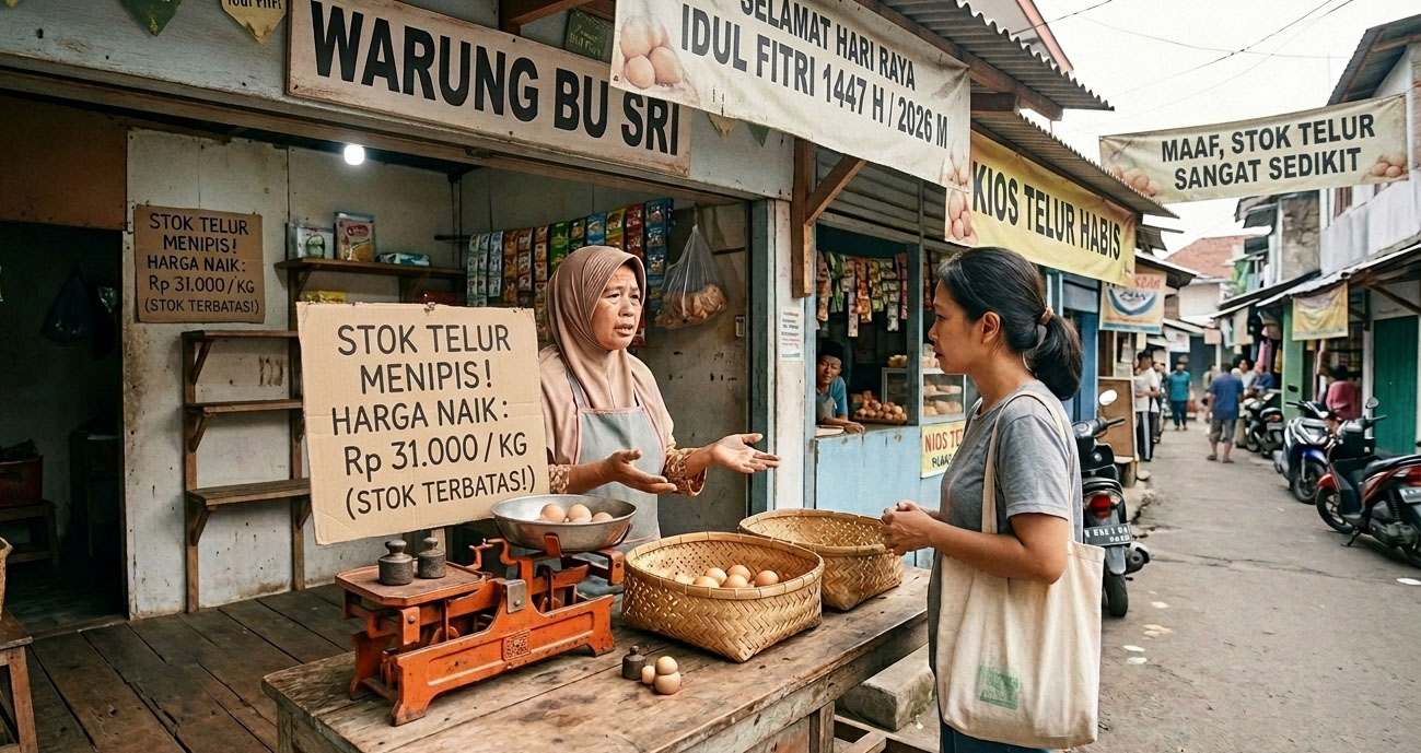 SUMATRALINK.ID, LAMPUNG – Pasca-Lebaran Idul Fitri 1447 H/2026 M, stok telur ayam di warung-warung dalam sebagian wilayah Kota Bandar Lampung dan Kabupaten Pesawaran terjadi kekosongan. Kelangkaan telur ayam tersebut terjadi karena lonjakan permintaan menjelang hari raya pada pertengahan Maret 2026. Pemantauan Sumatralink.id, Rabu (25/3/2026), stok telur ayam di toko dan warung milik warga pada hari keempat Idul Fitri mengalami kekosongan. Warga terpaksa mencari telur ayam ke daerah-daerah pelosok. Meski tersedia stok telur ayam walaupn sedikit, harganya sudah naik menjadi Rp 31.000 per kg dari Rp Rp 28.000 per kg. Warga tidak peduli, yang penting telur ayamnya tersedia. Keterangan yang diperoleh, pasokan telur ayam dari agen terjadi kemacetan. Pemilik warung menyatakan pasokan telur ayam tidak biasanya terjadi seperti ini. “Biasanya pasokan telur ayam sudah tersedia pada H+3 Lebaran, tapi sampai hari ini telur ayam belum juga datang. Katanya, nanti sore,” kata Wati, pemilik warung di Kelurahan Kurungan Nyawa, Kabupaten Pesawaran, Lampung, Rabu (25/3/2026). Dia mengatakan, permintaan telur ayam menjelang hari raya Idul Fitri mengalami lonjakan yang drastis dari biasanya. Pada saat itu, ujar dia, permintaan tinggi, pasokan telur ayam ke warungnya bisa mencapai tiga kali lipat. Pemilik toko kebutuhan dapur di Kemiling Bandar Lampung, juga mengalami hal sama. Pasokan telur ayam dari agen telur ayam pasca-Lebaran Idul Fitri mengalami keterlambatan. “Tidak biasanya, dari agen telat. Biasanya sudah masuk banyak. Sekarang banyak yang mau beli telur ayam tapi bagaimana stok habis,” kata Maulana, warga Jl Mata Air, Kemiling, Bandar Lampung. Untuk memenuhi kebutuhan rumah tangga, warga Kemiling (Bandar Lampung) dan juga di Kurungan Nyawa (Pesawaran), terpaksa mencari telur ayam untuk kebutuhan dapur rumah tangga sehari-hari ke daerah pelosok. “Saya terpaksa mencari ke warung-warung pelosok di Negeri Sakti, Pesawaran. Barangkali di daerah tersebut masih tersedia stok telur ayam, karena permintaan sedikit,” ujar Marli, warga Kurung Nyawa, Pesawaran. Sebagian kecil warung milik warga, masih menyimpan stok telur ayam sebelum Lebaran. Pemilik warung terpaksa menaikkan harga menjadi Rp 31.000 per kg dari harga jual sebelumnya Rp 28.000 sampai Rp 29.000 per kg. (Emye) Editor: Mursalin Yasland Facebook WhatsApp Twitter Threads Navigasi pos Hilang di Penjara Sebelum Lebaran, KPK: Yaqut Jadi Tahanan Rumah KPK Terima Karangan Bunga Sindiran dari MAKI